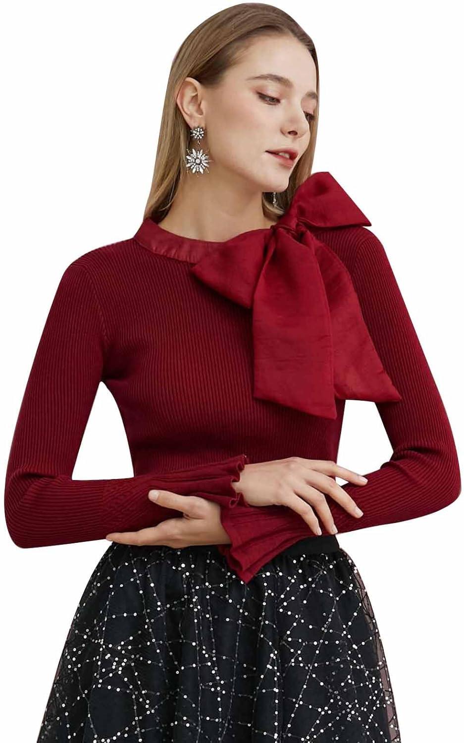 imageCHICWISH Women Bow Tied Slim Fitted Elegant Long Sleeve Knit Top and Sequins Tulle Holiday Flowy Skirts SM