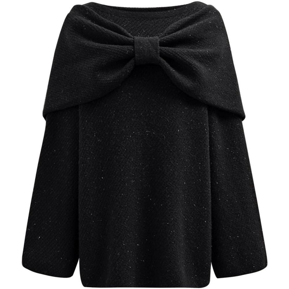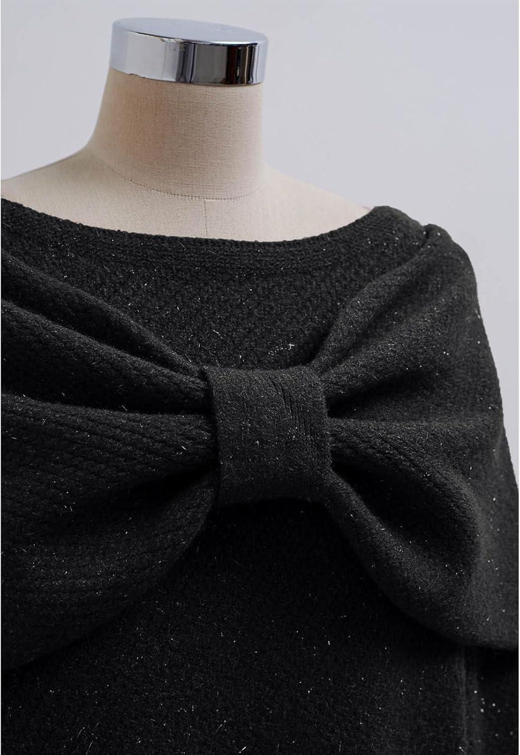 CHICWISH Women Bowknot 2 Pieces Mini Sweater Dress Boat Neck Long Sleeve Cute Metallic Mix Party Knit Pullover Sweater(Black)