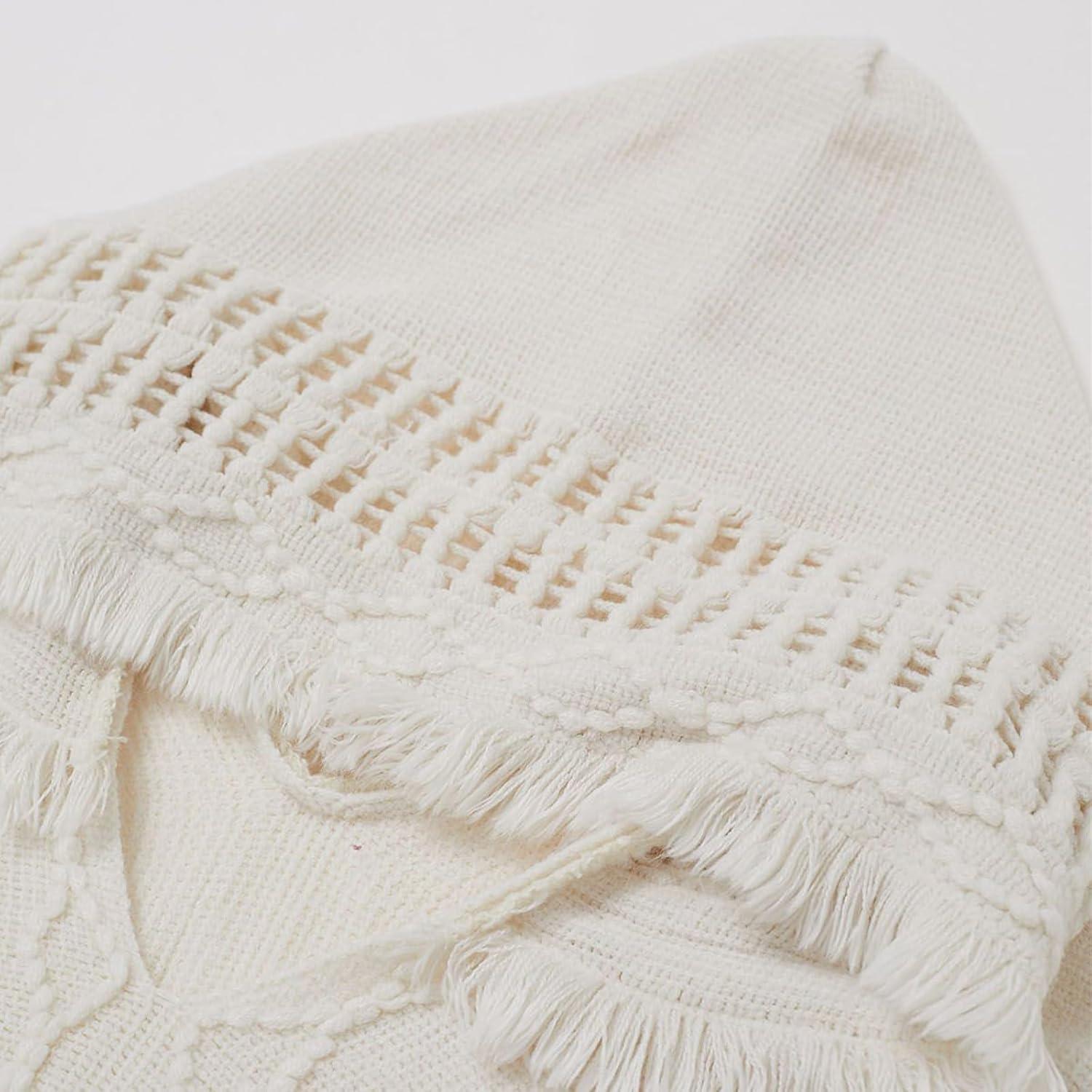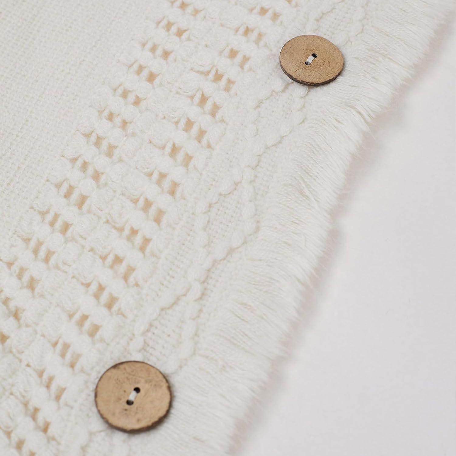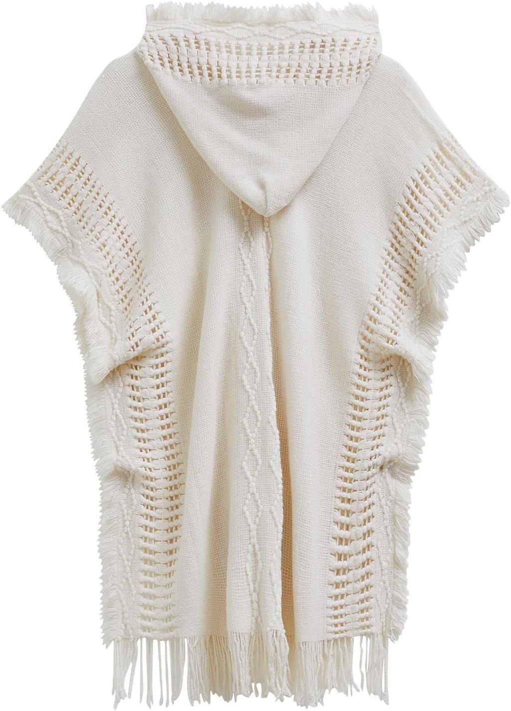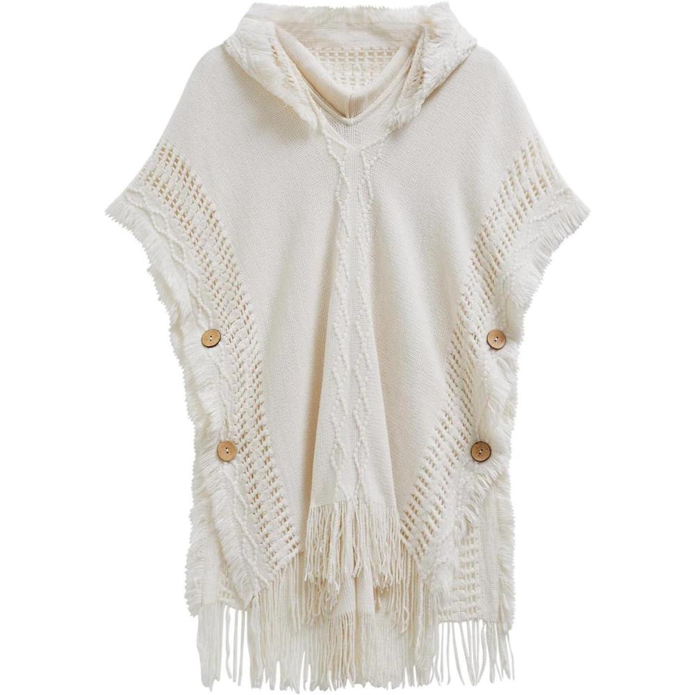 CHICWISH Women Diamond Pattern Fringe Hooded Poncho Shawl Casual Lightweight Button Decor Knit Pullover Sweater Cape(Ivory)