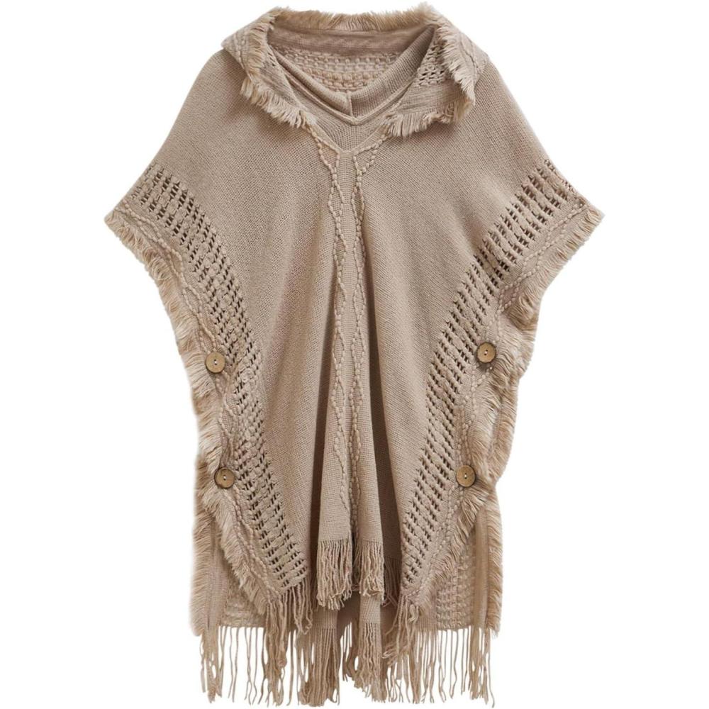 Be the first to review “CHICWISH Women Diamond Pattern Fringe Hooded Poncho Shawl Casual Lightweight Button Decor Knit Pullover Sweater Cape(Sand)” Cancel reply