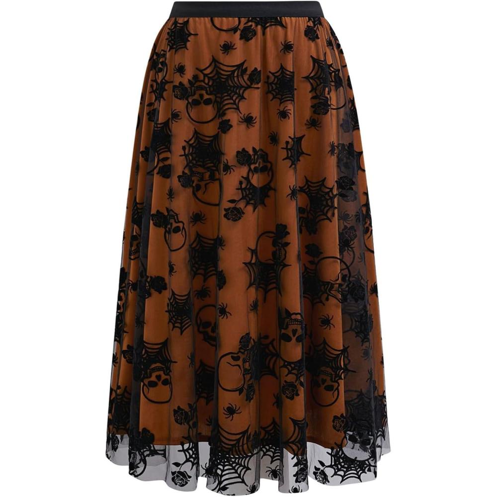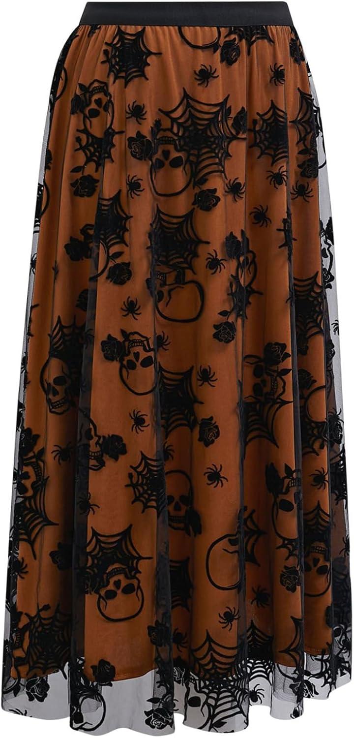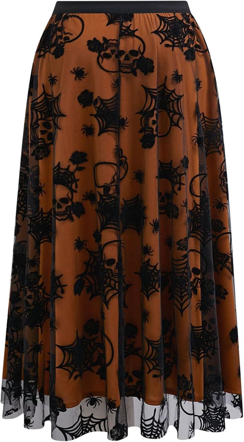 CHICWISH Women Halloween Skull Mesh Tulle Skirt Elastic Waist A-Line Halloween Party Spider Web Layered Midi Skirt(Pumpkin)