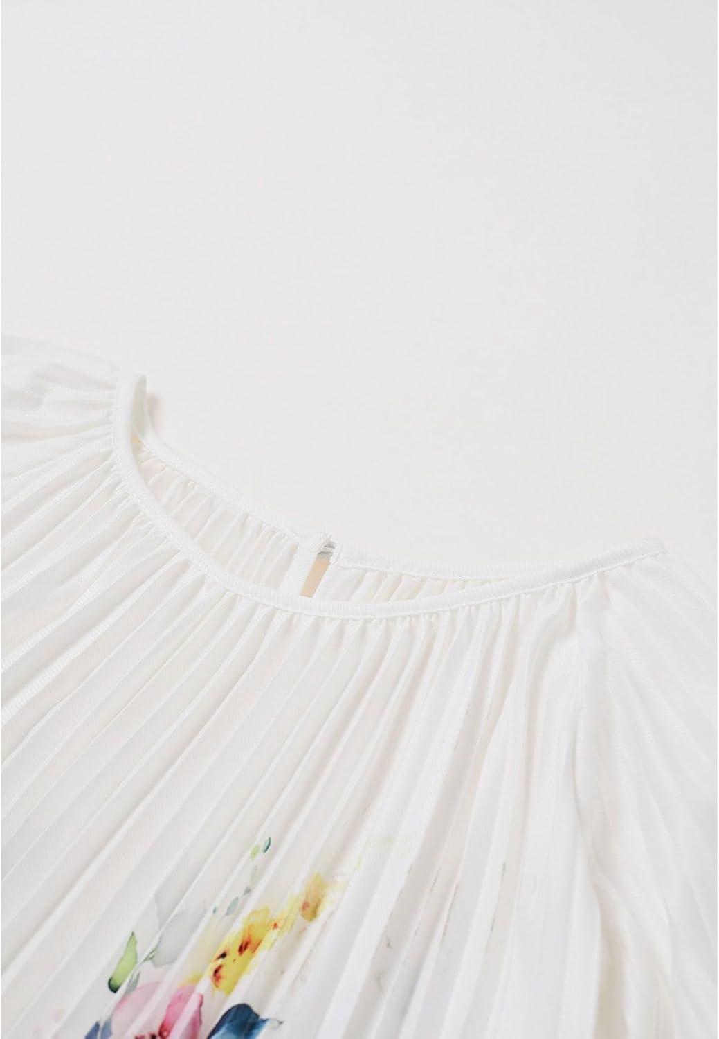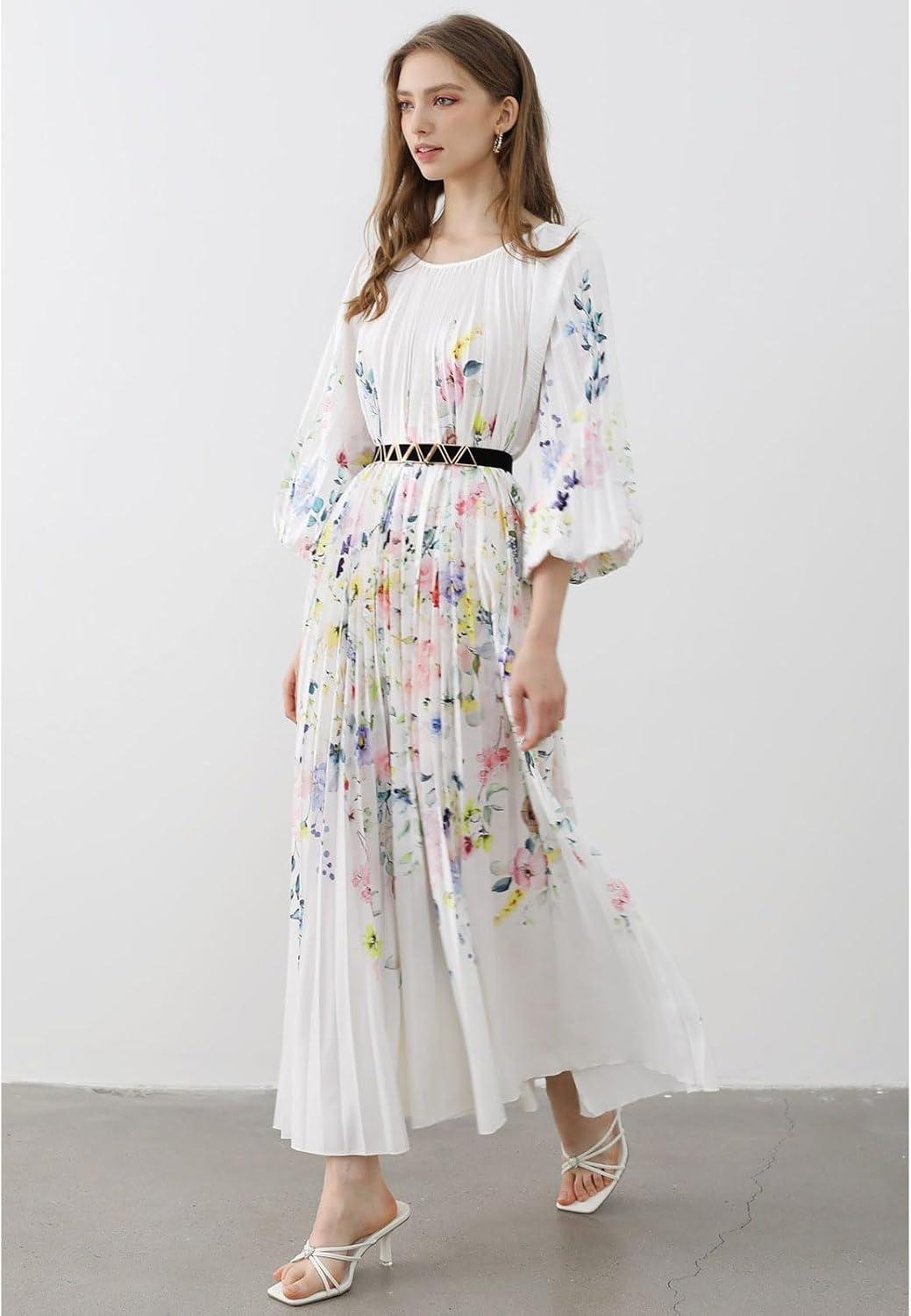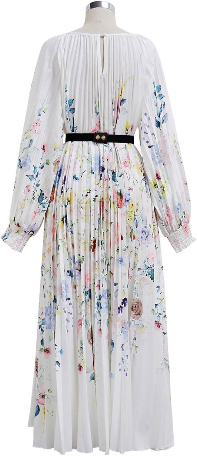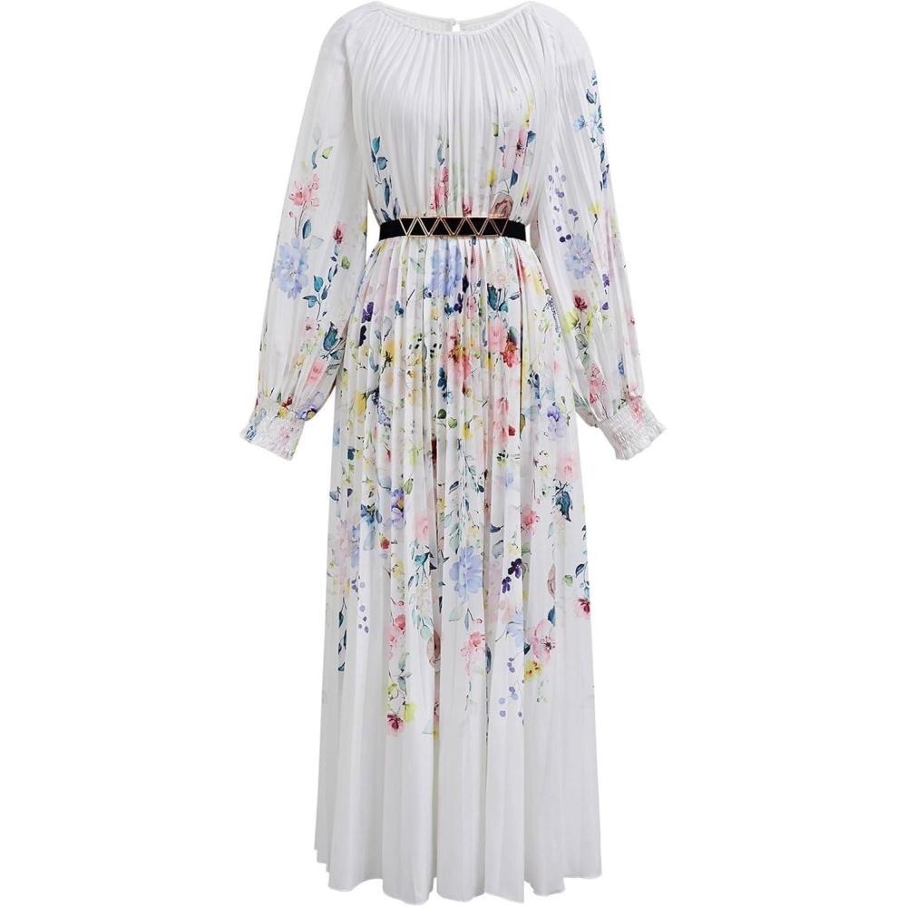 CHICWISH Women Long Sleeve Maxi Dress Watercolor Floral Print Crewneck Casual Pleated Summer Long Dresses with Belt(White)