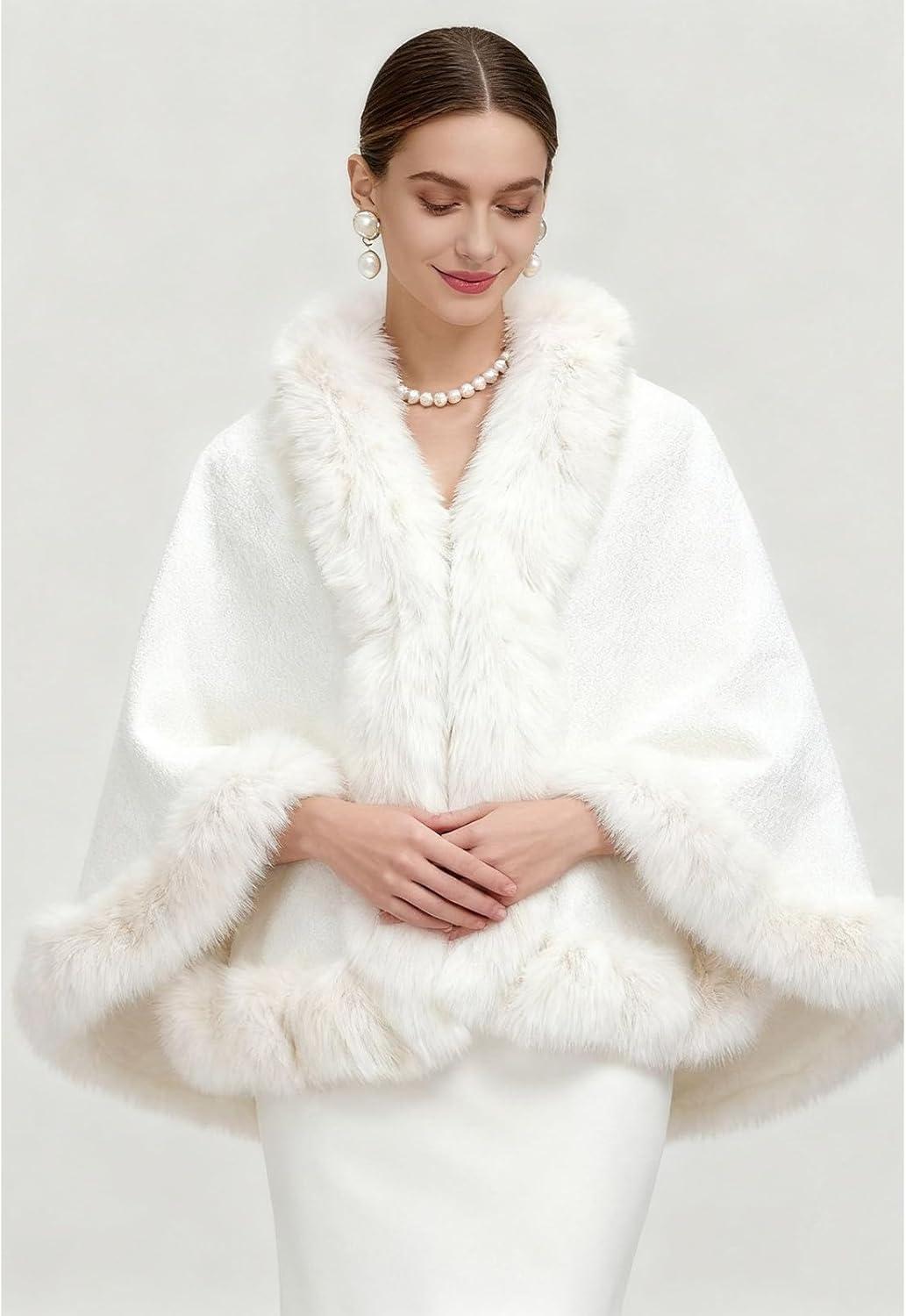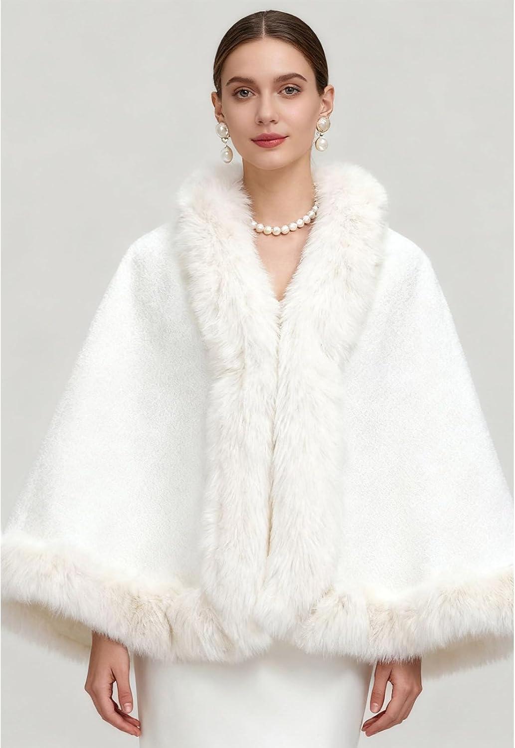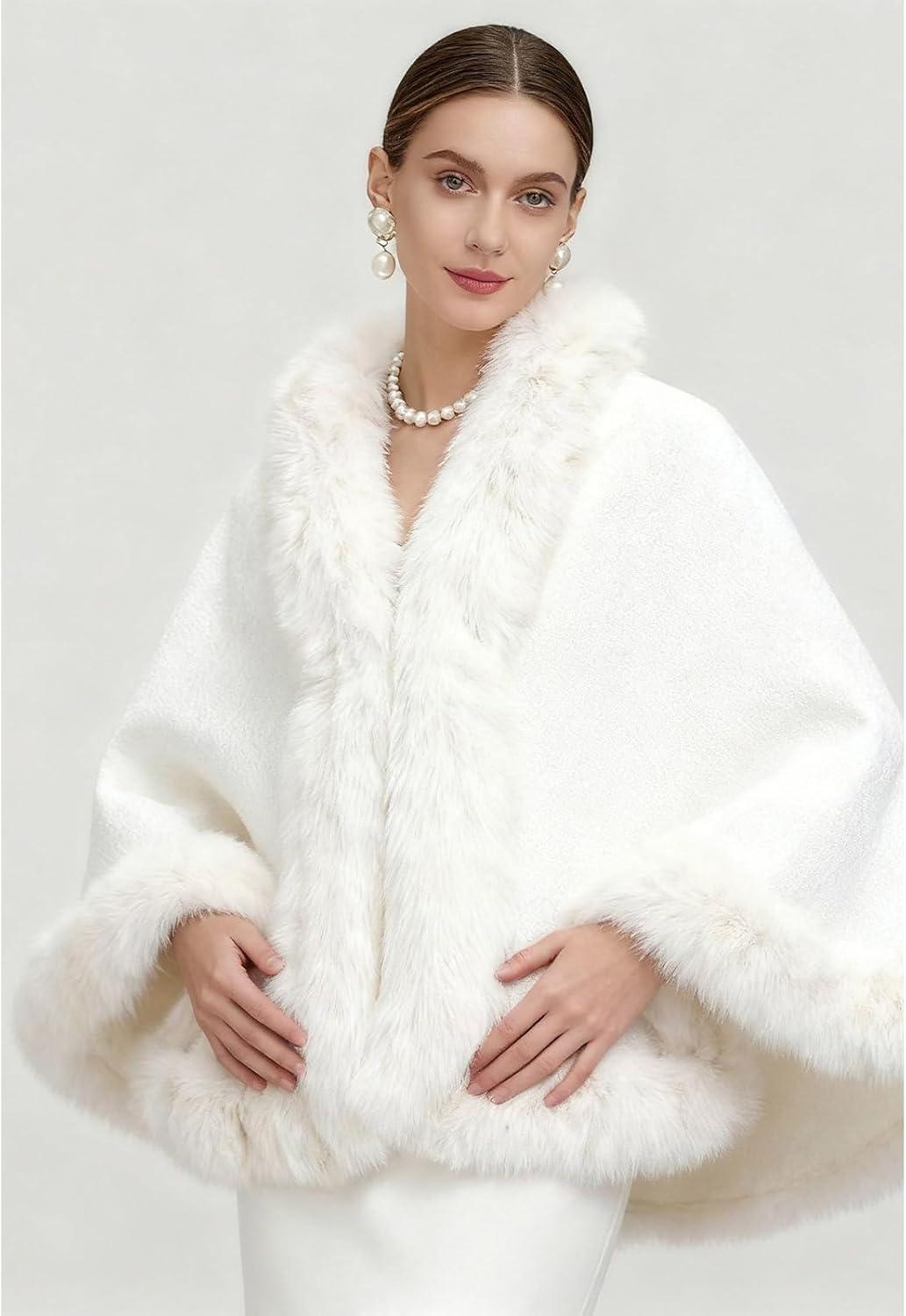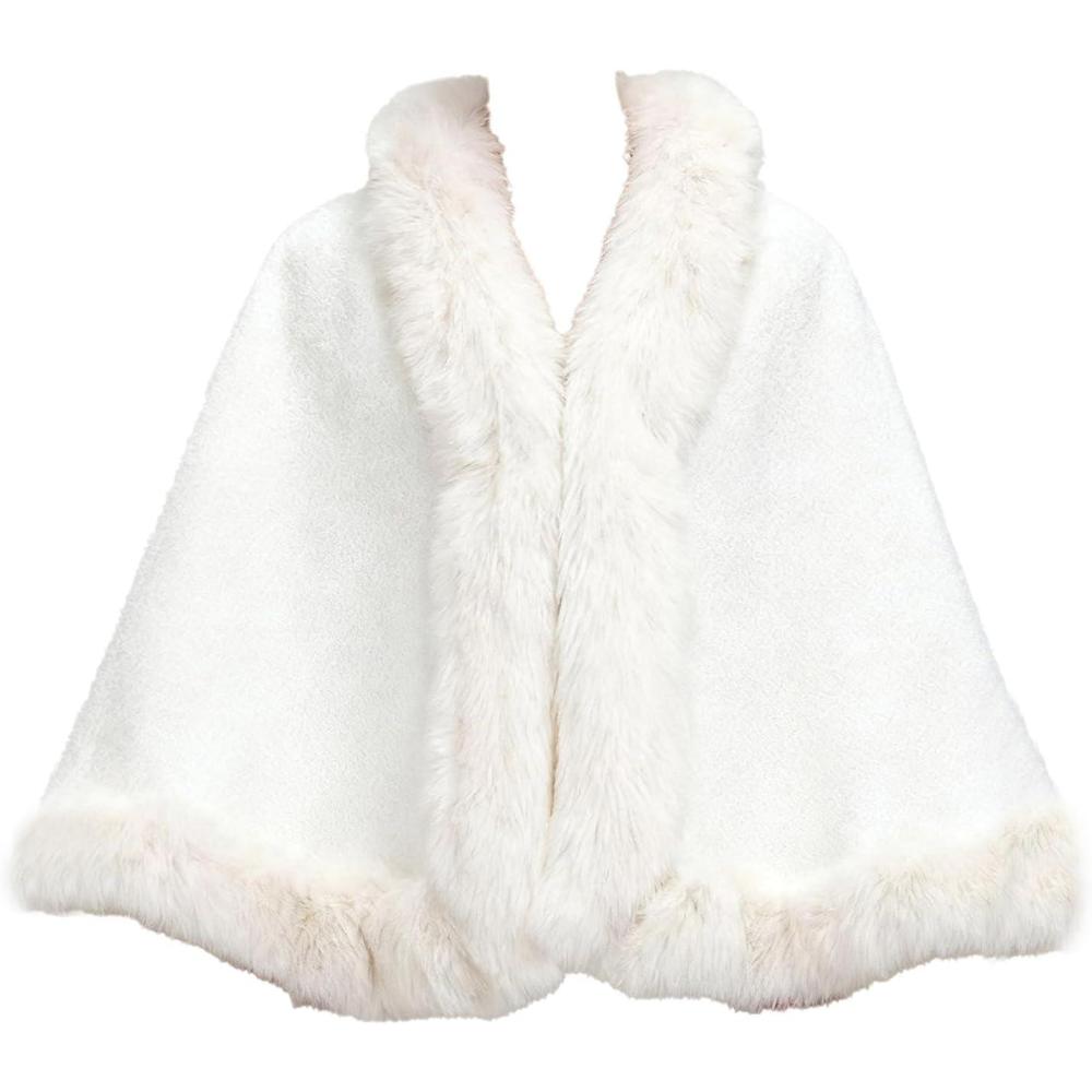 CHICWISH Women Regal Faux Fur Trimmed Poncho Fall Winter Casual Soft Chunky Batwing Sleeve Shawl Wraps Cloak Cape Coat White