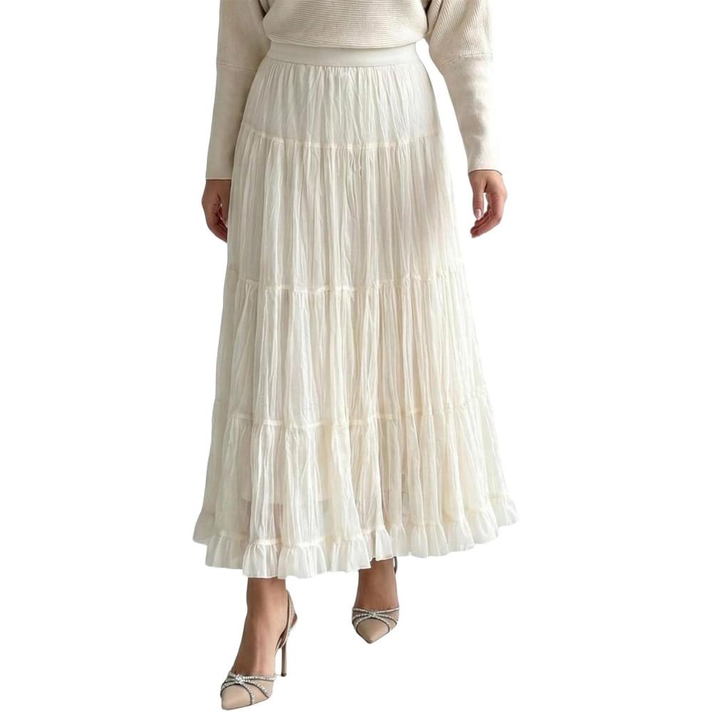Chicwish Women Reversible Pleated Tulle Maxi Skirt Elastic Waisted Ruffle Tiered Layered Tutu Mesh Flowy Long Skirts(Cream)