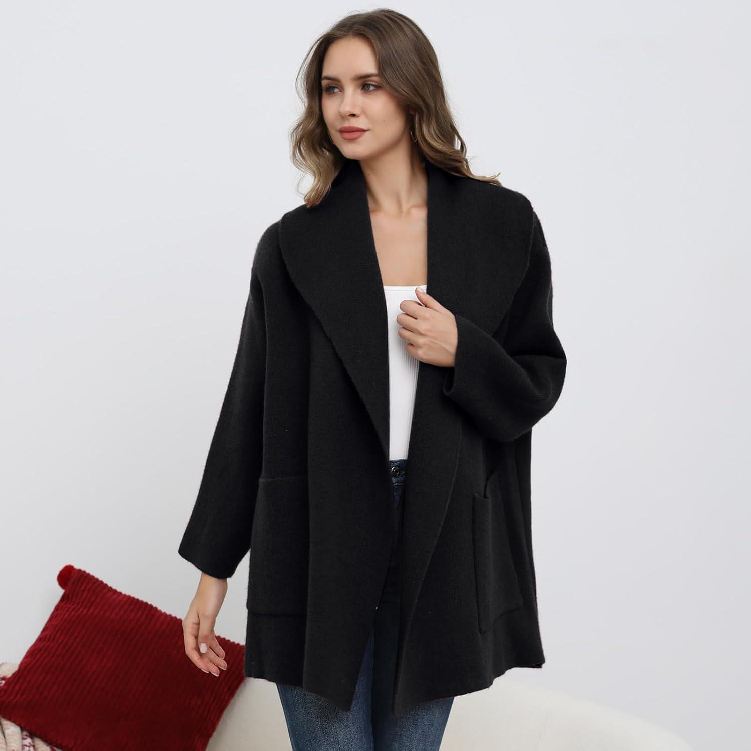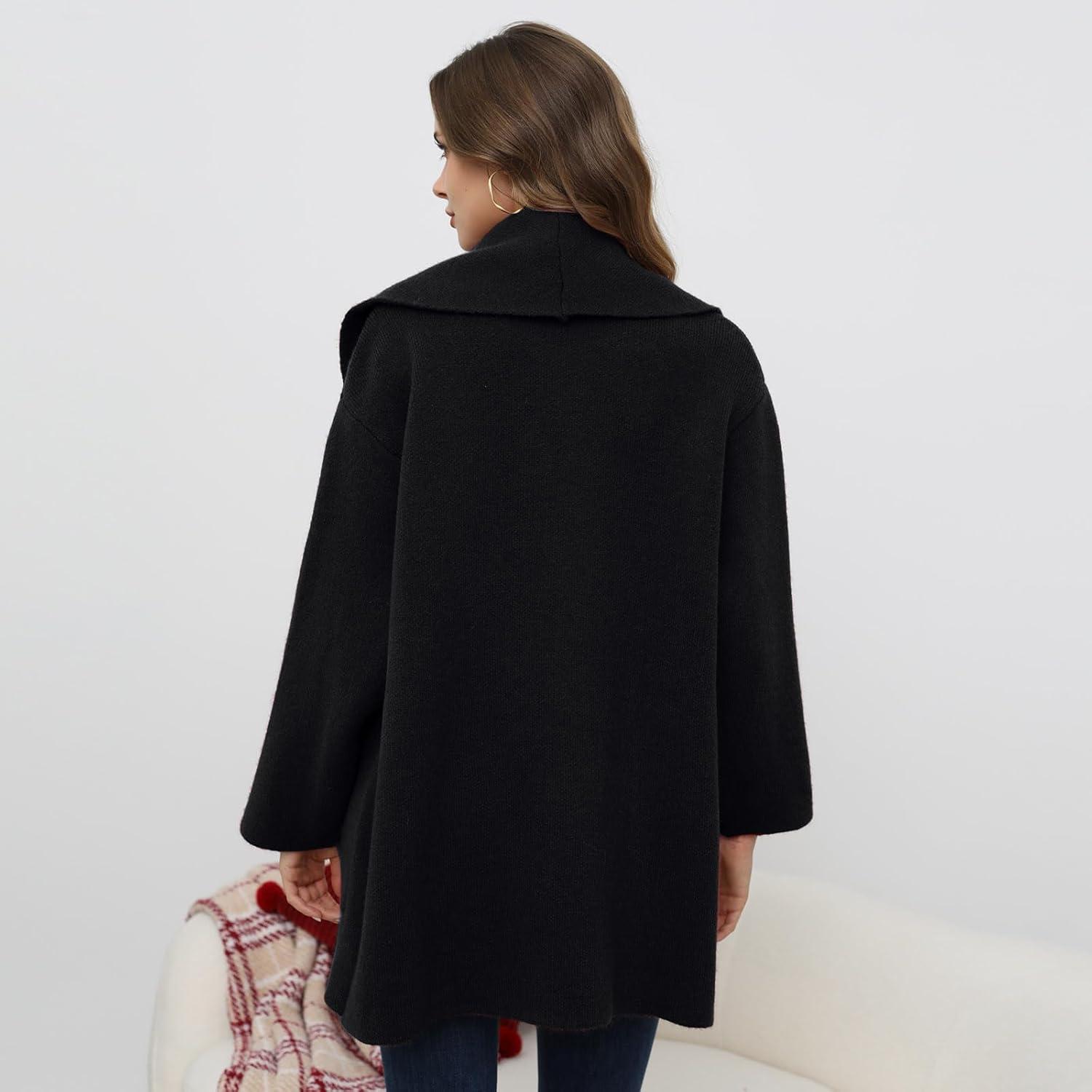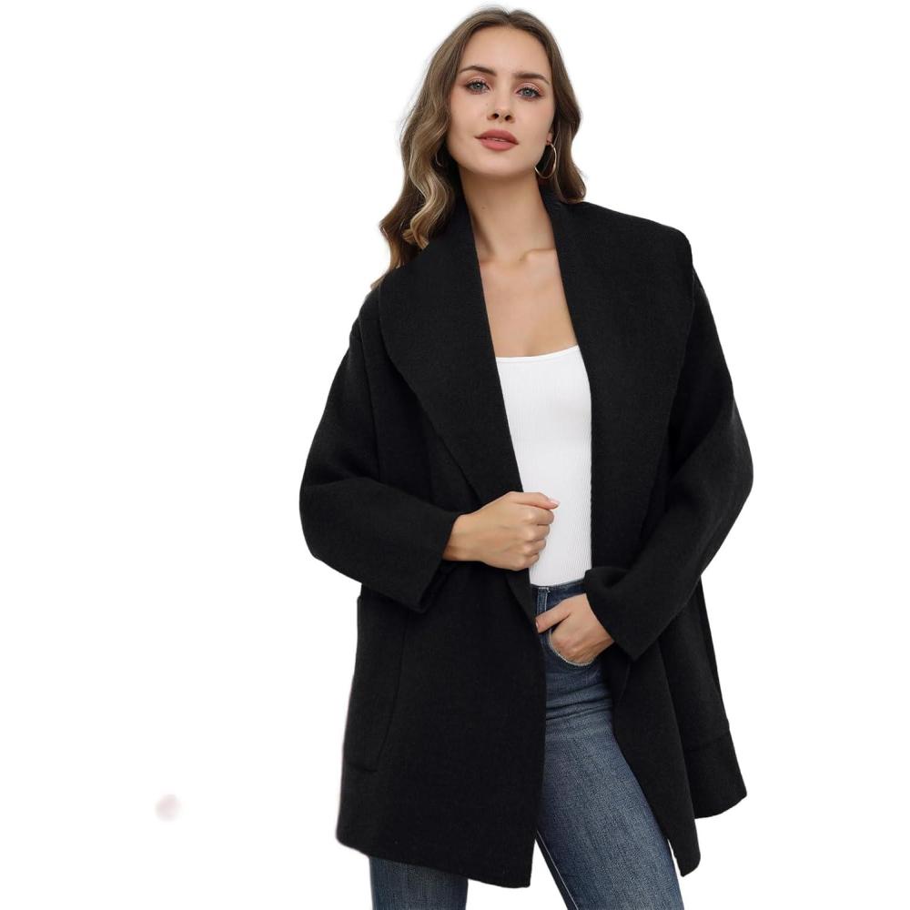 CHICWISH Women Wide Collar Open Front Knit Cardigan Coat Fall Winter Shawl Knit Sweater Coat Outwear with Pockets(Black)