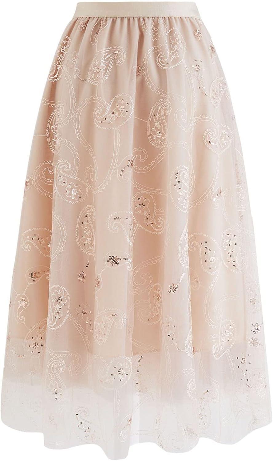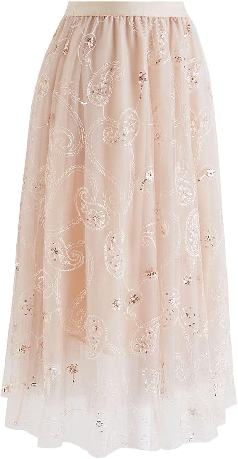 CHICWISH Women's Black/Apricot Sequined Embroidered Paisley Mesh Midi Skirt(Apricot)