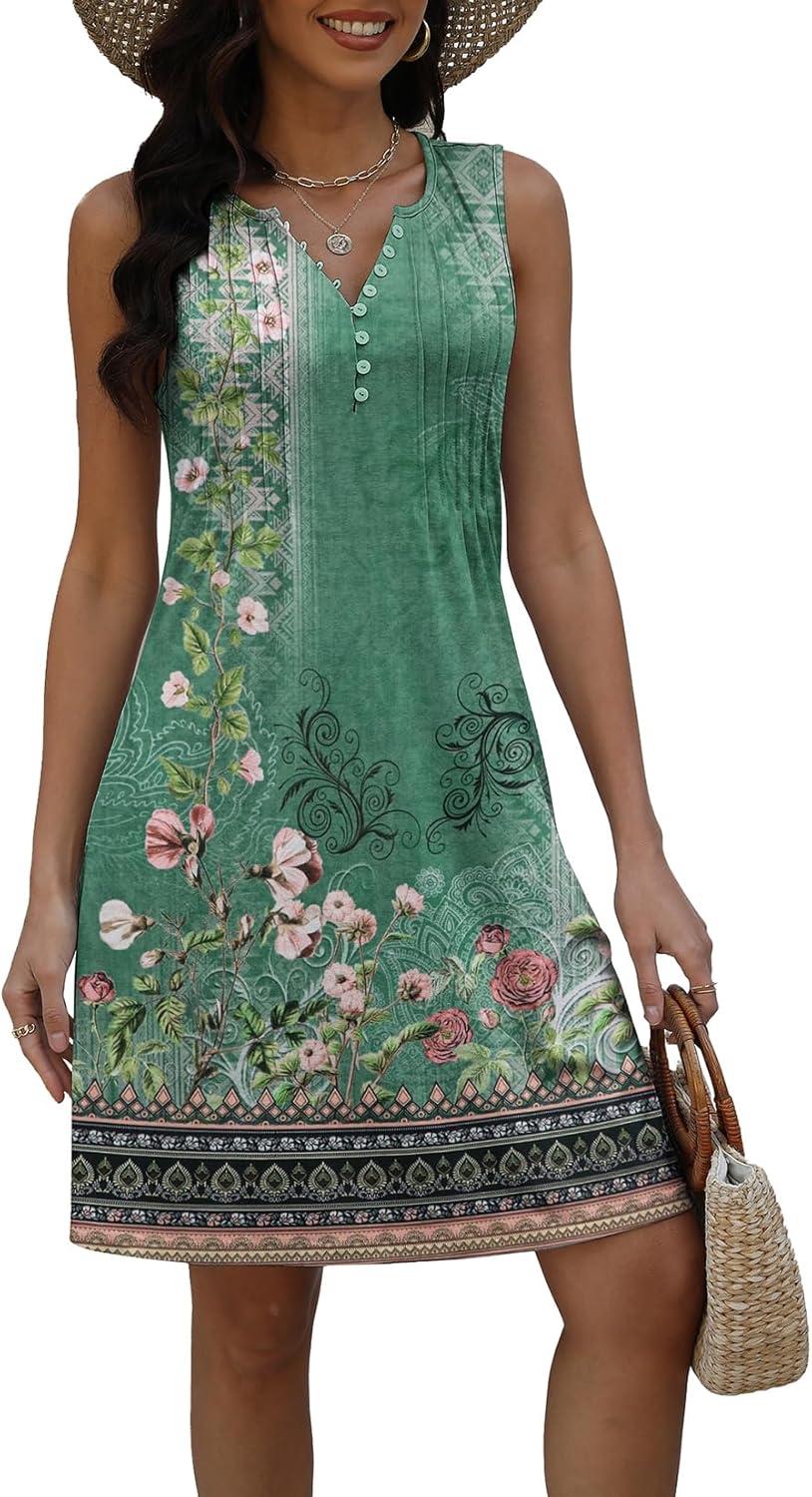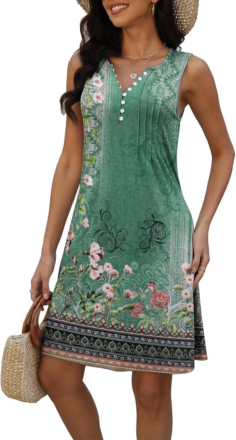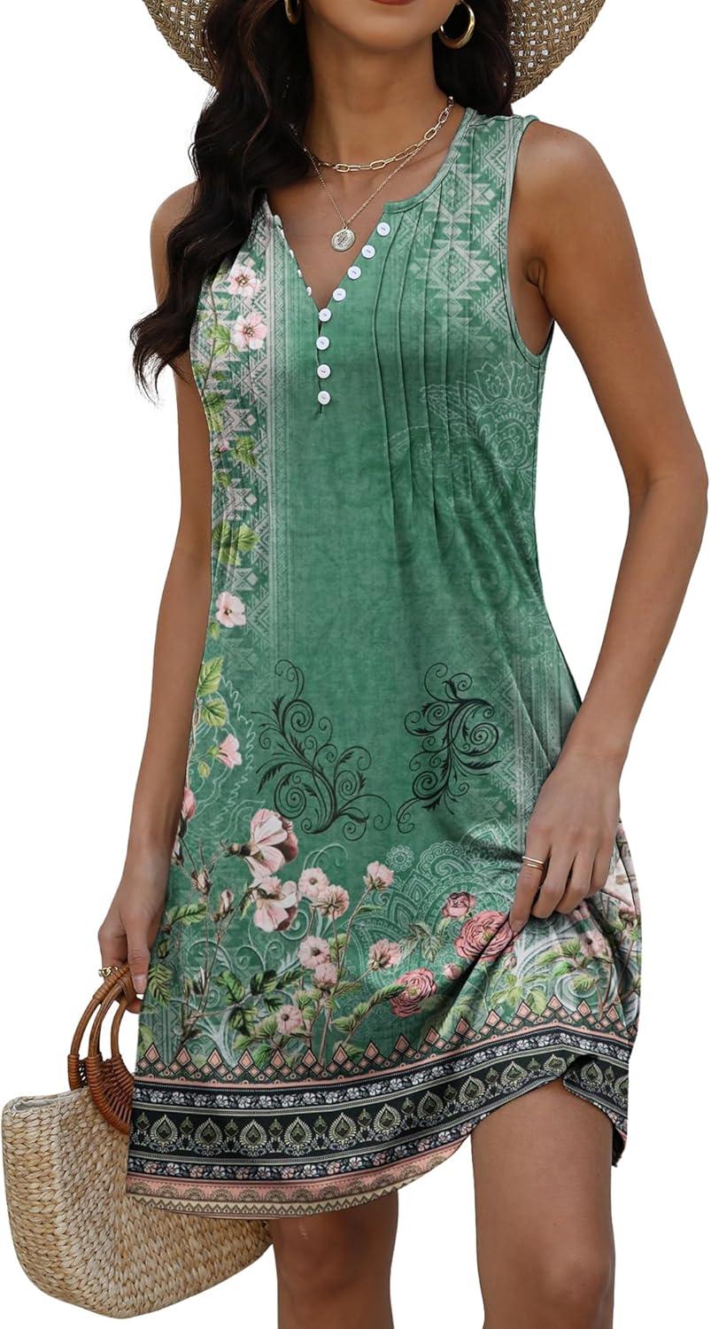 Disamer Beach Dresses for Women 2024 Vacation Swim Cover up V-Neck Summer Dress Button Down Sleeveless Boho Floral Sundress(Flower Wallpaper Green)