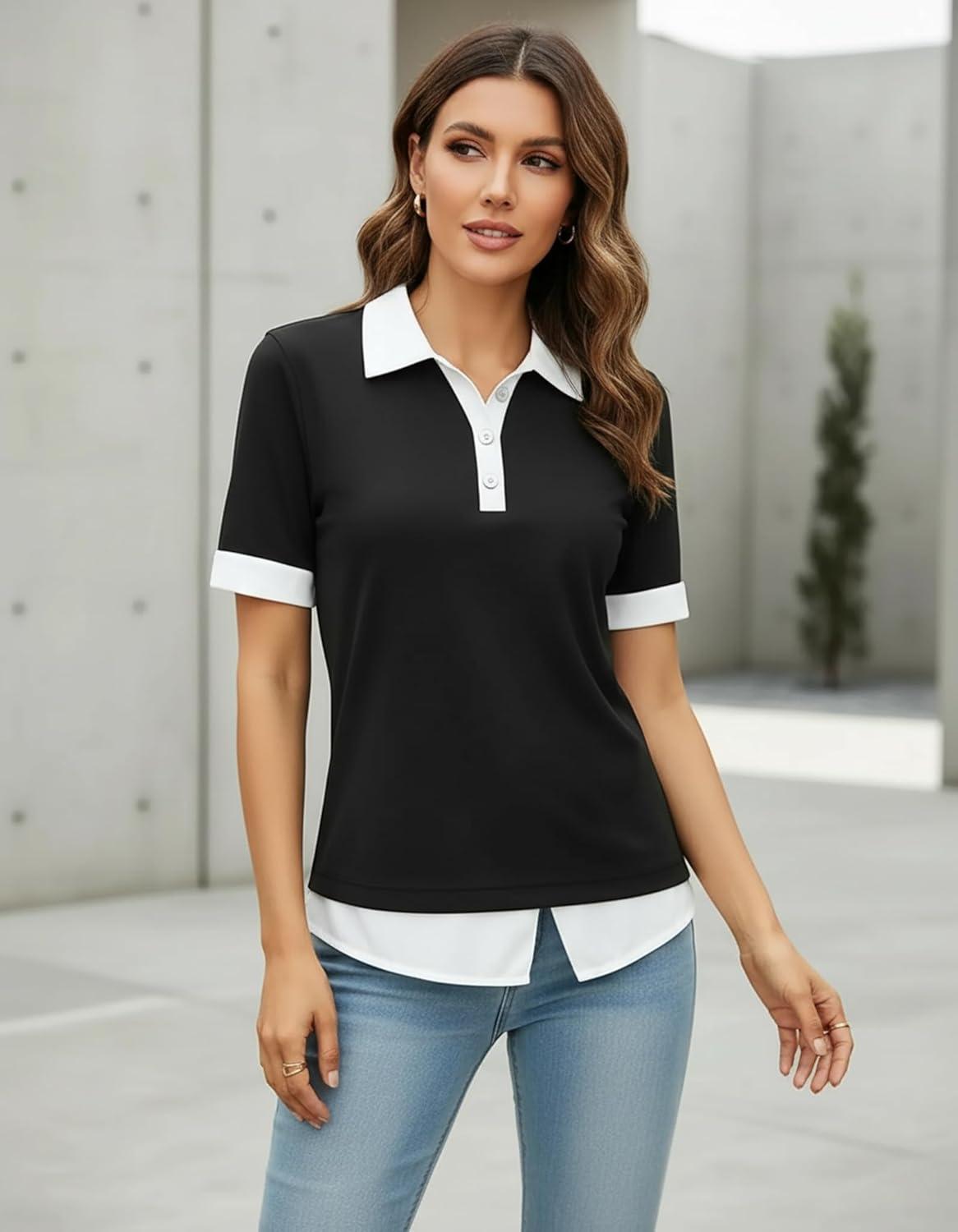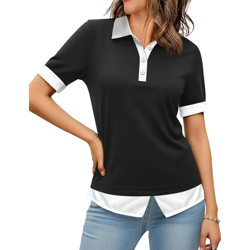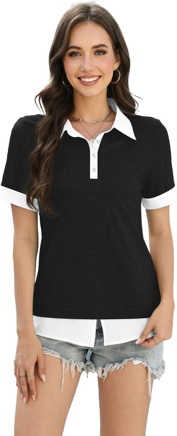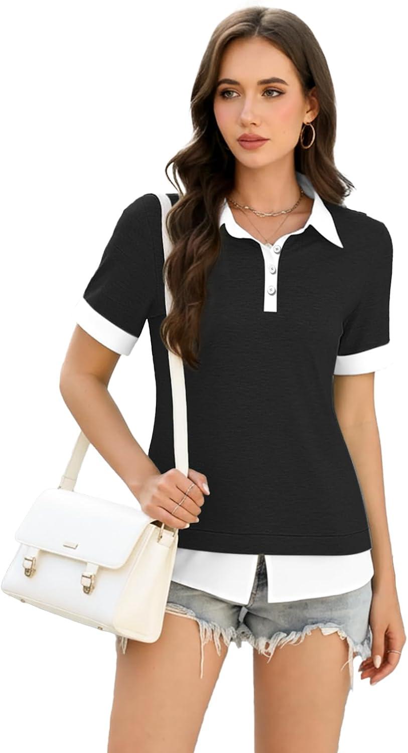 Disamer Womens Summer Tops Spring Fashion 2025 Short Sleeve Shirts Patchwork Button V Neck Tunic Tops Casual Work Blouses(Pure Black)