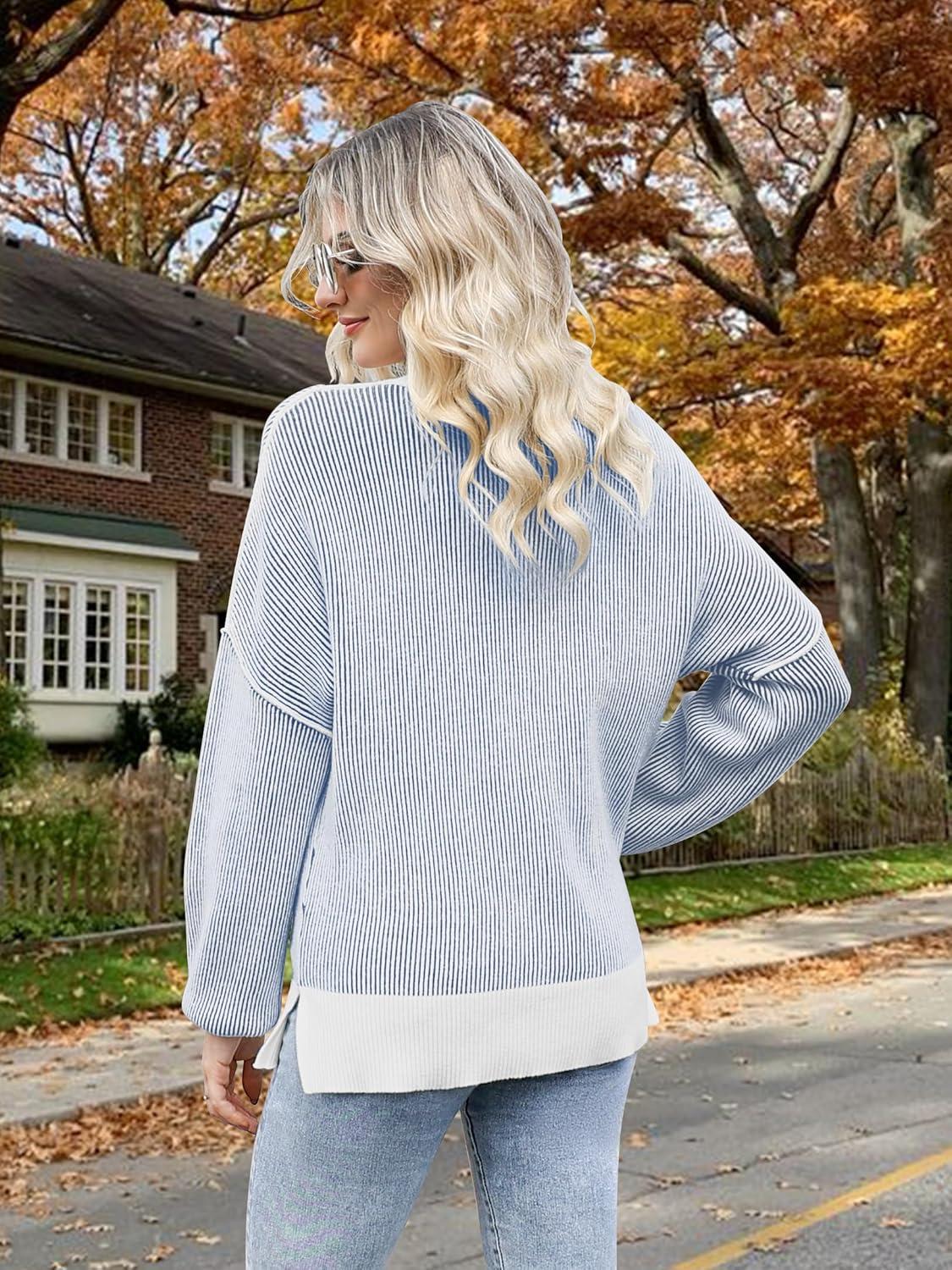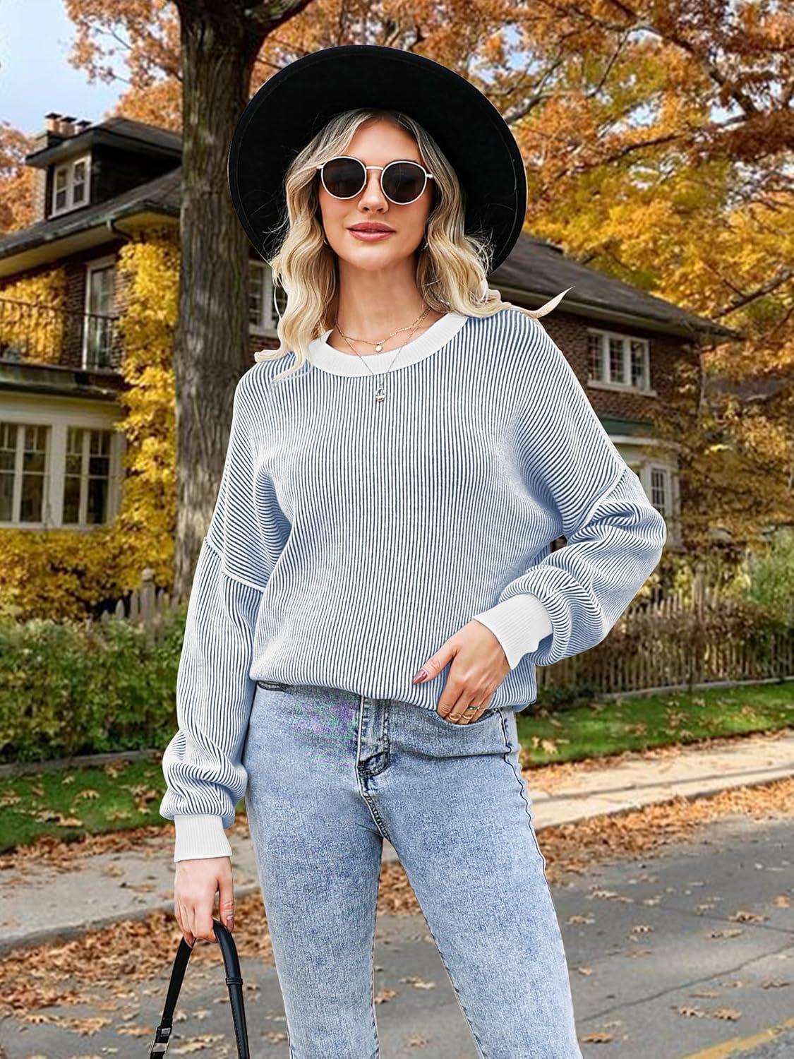 Disamer Womens Sweaters 2025 Fall Clothes Batwing Long Sleeve Striped Knit Pullover Tops Fashion Outfits Oversized Sweater(Pure Blue)