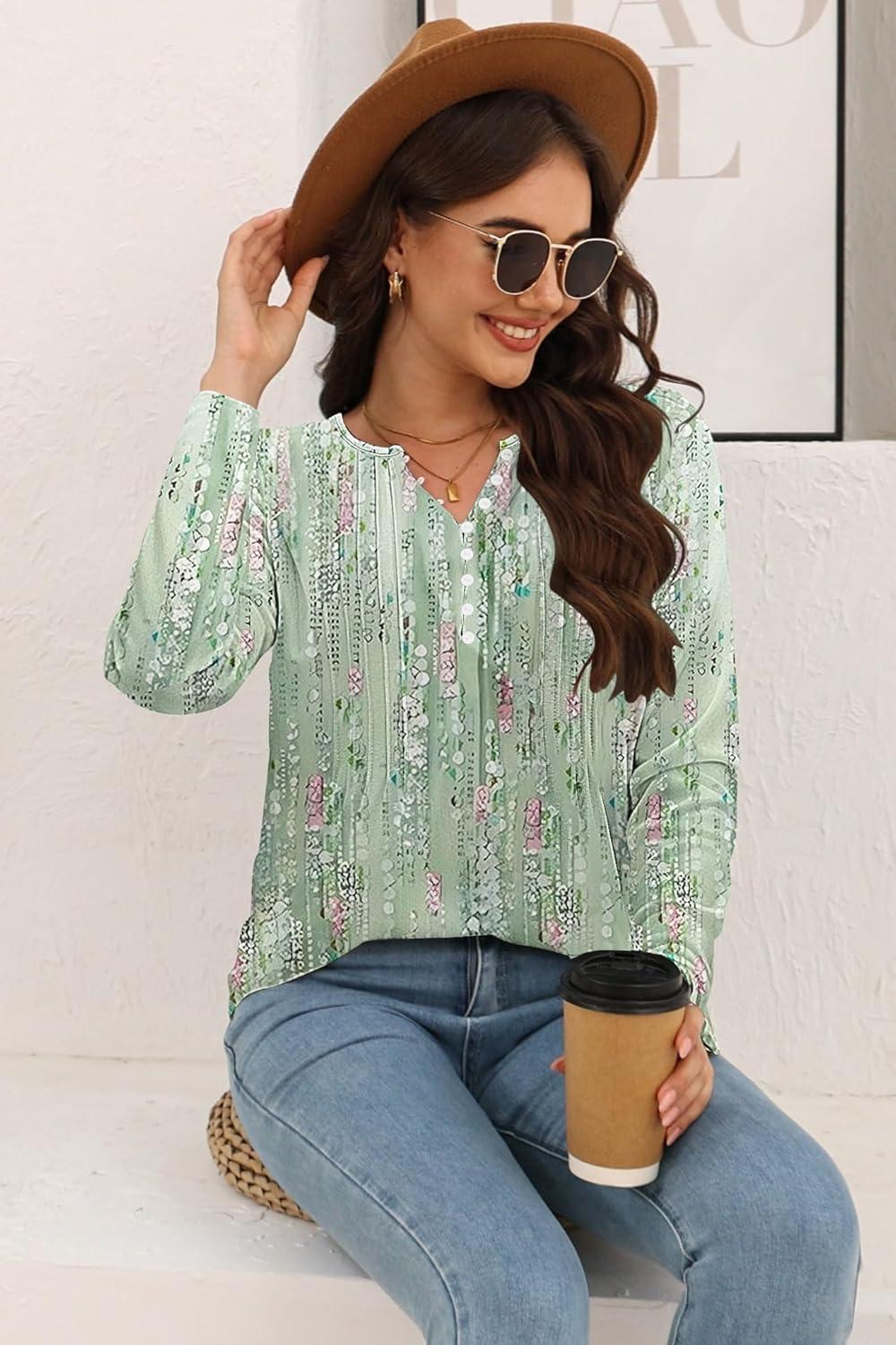 Disamer Womens T Shirts 2025 Fashion Tops Long Sleeve Pleated Dressy Casual Button Down Blouses Fall Clothes(Floral Totem)