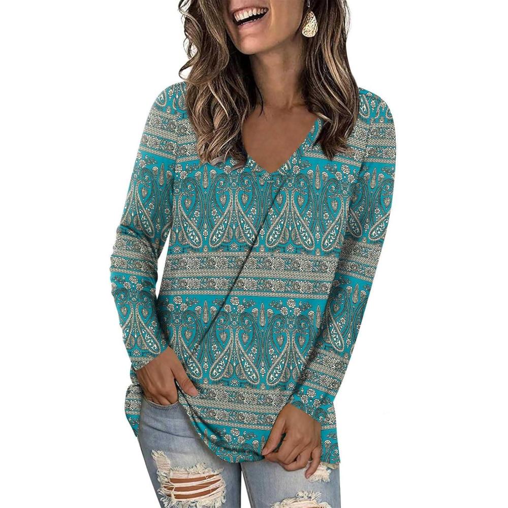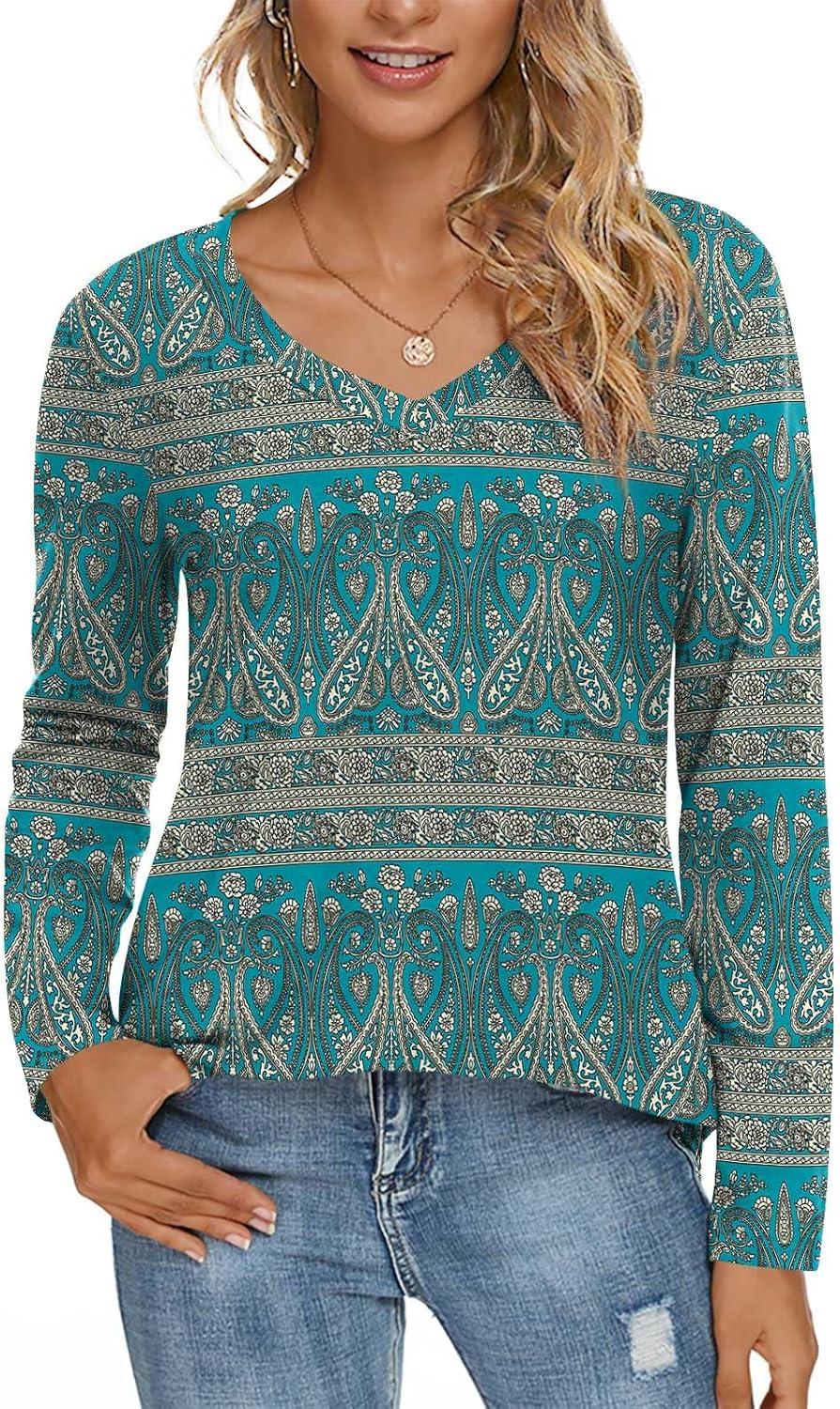 LONGYUAN Women Long Sleeve Tops Vneck Shirts Basic Loose Tunic Tops Casual 2025 Trendy Blouses(Blue-khaki)