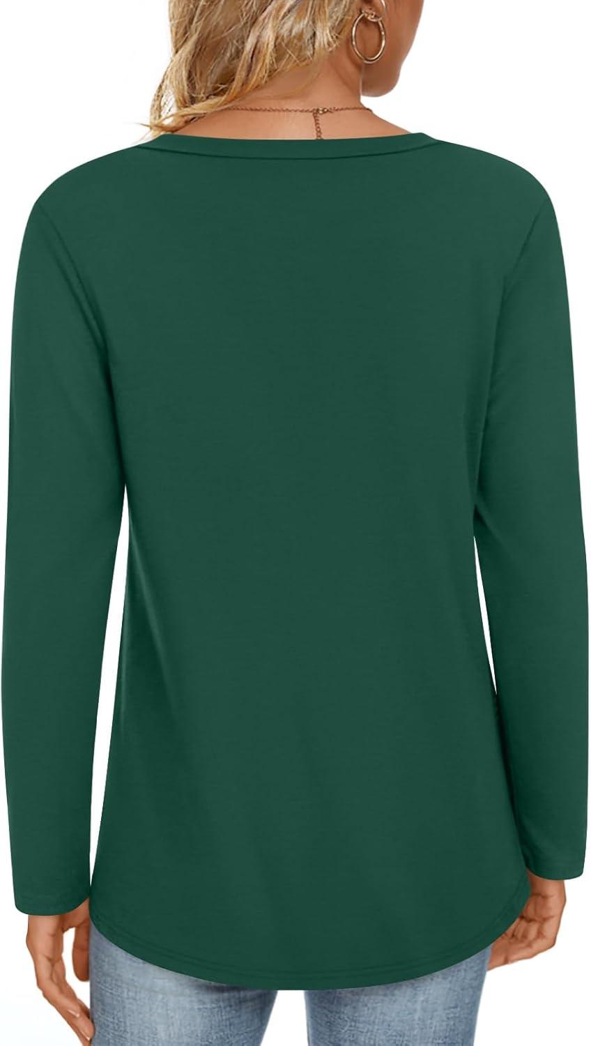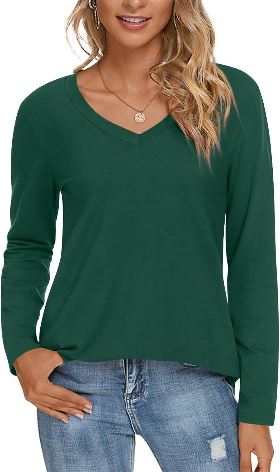 LONGYUAN Women Long Sleeve Tops Vneck Shirts Basic Loose Tunic Tops Casual 2025 Trendy Blouses(Dark Green)