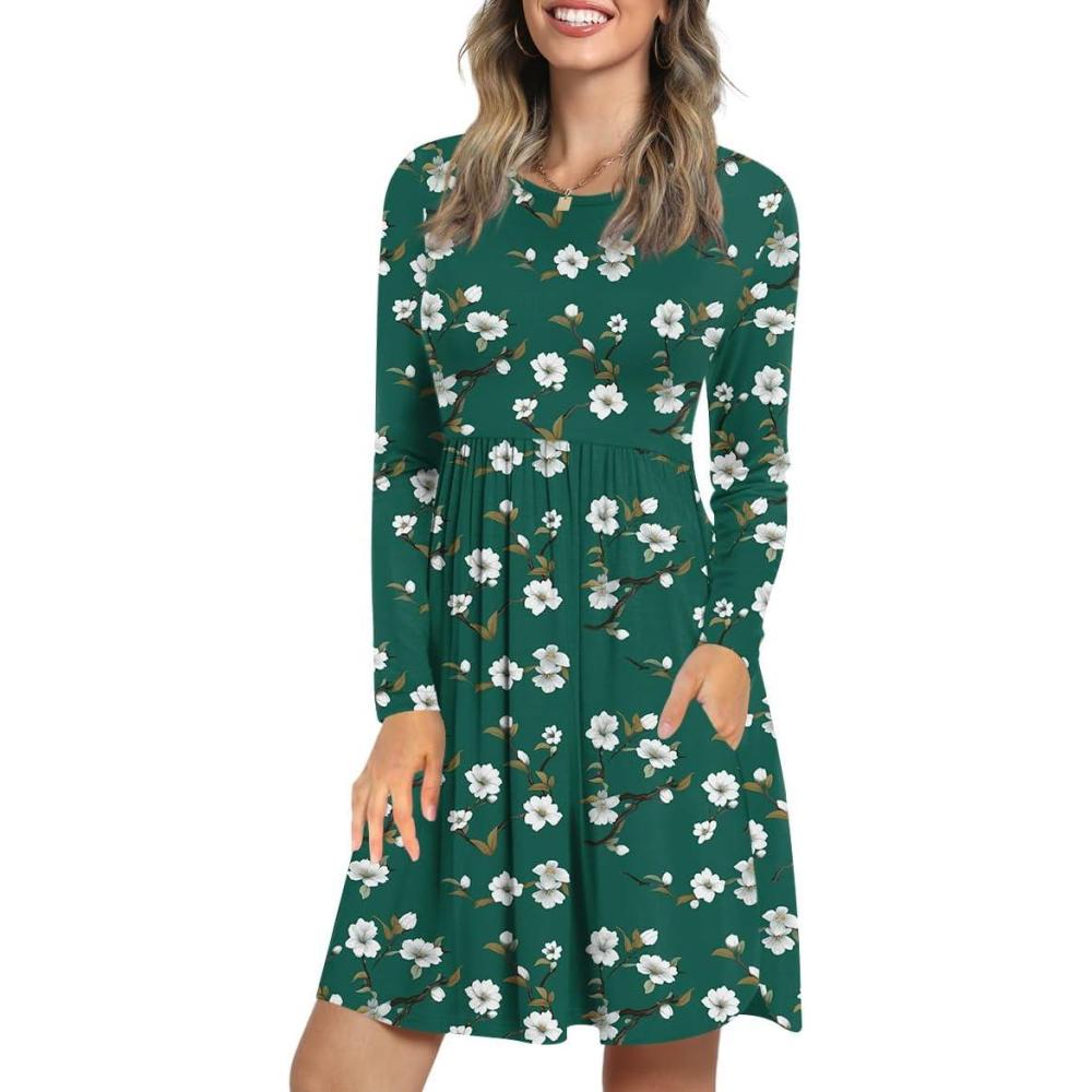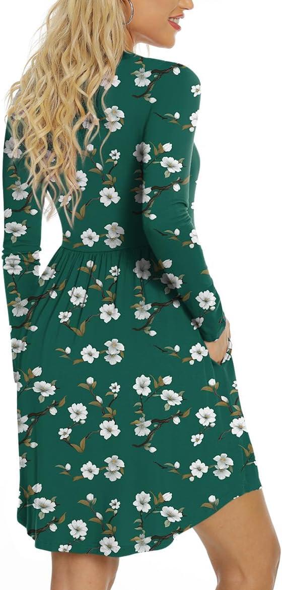 LONGYUAN Womens Dress Long Sleeve Knee Length Dresses Casual Fall Dress with Pockets Trendy 2025(Green Begonia Fl)