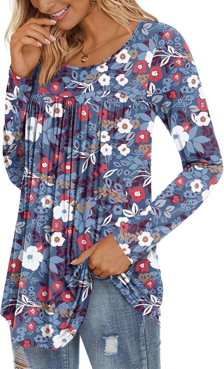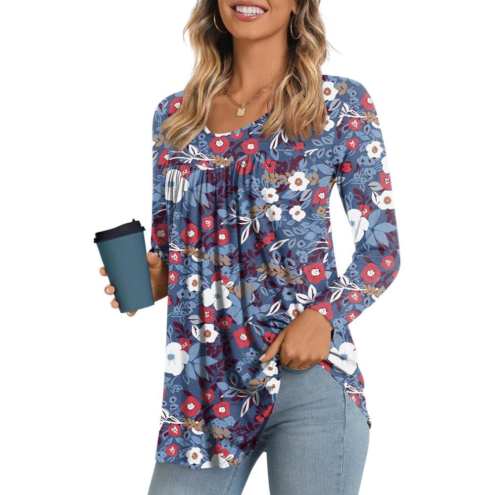 LONGYUAN Women's Long Sleeve Casual Tunics Tops 2025 Winter Loose Shirts Flare Blouse Comfy Elastic Cute(Mixed Blue Red-flower)