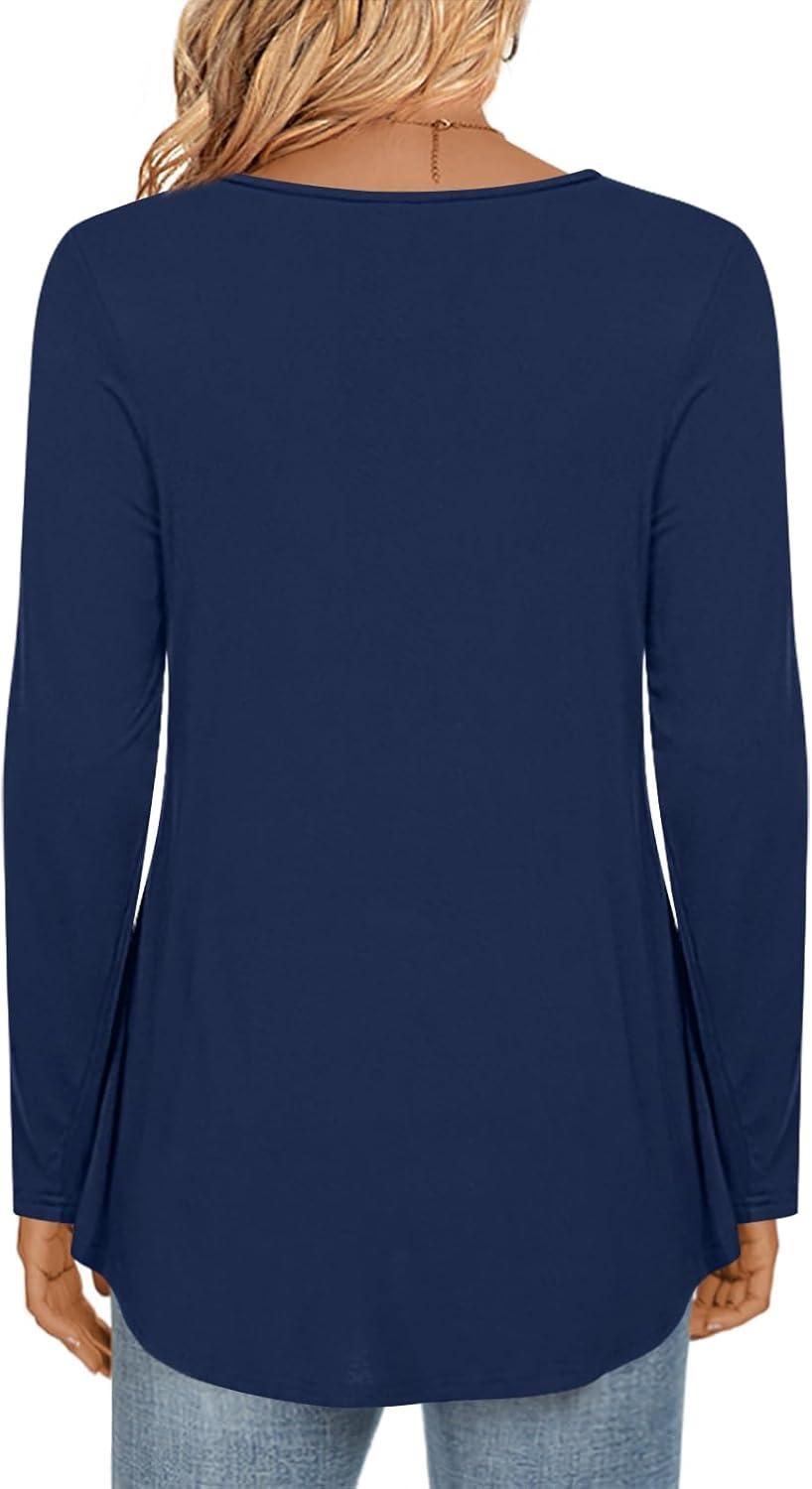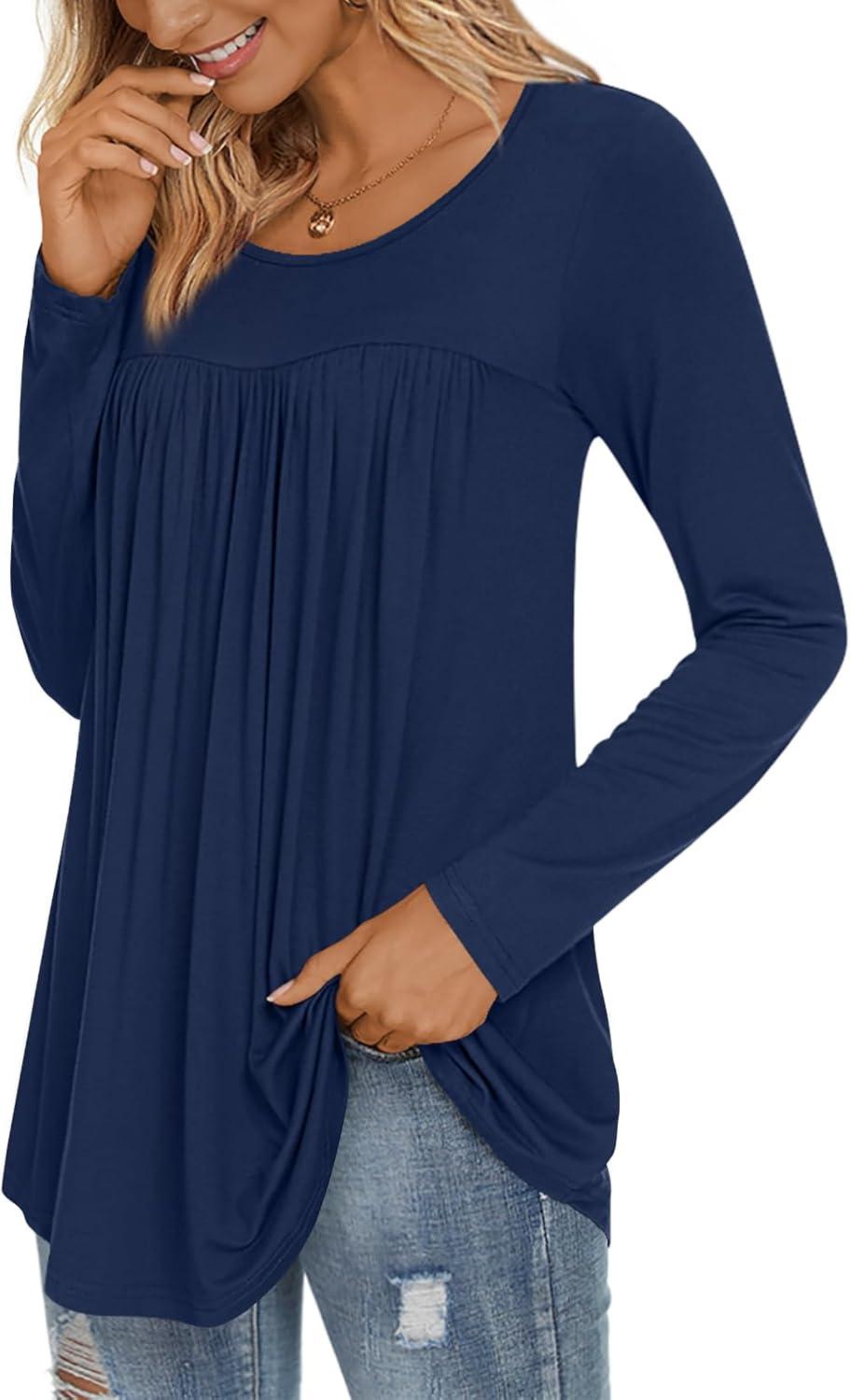 LONGYUAN Women’s Long Sleeve Casual Tunics Tops 2025 Winter Loose Shirts Flare Blouse Comfy Elastic Cute(Navy Blue)