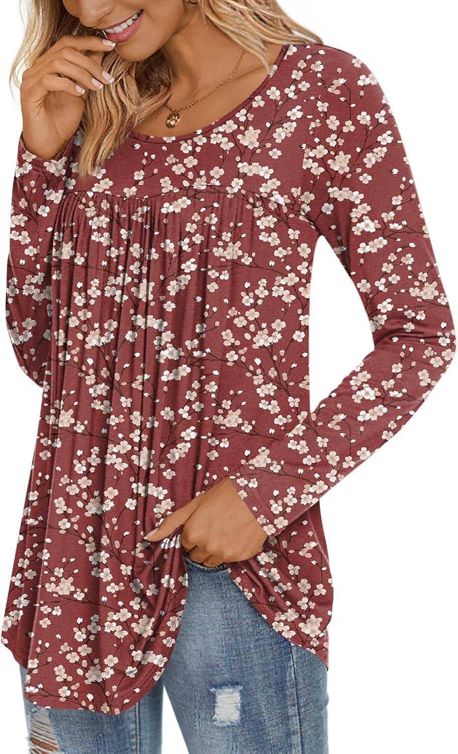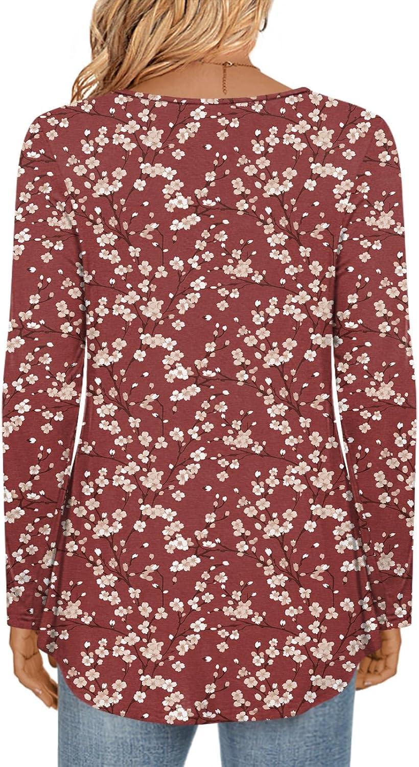 LONGYUAN Women’s Long Sleeve Casual Tunics Tops 2025 Winter Loose Shirts Flare Blouse Comfy Elastic Cute(Red Flower)