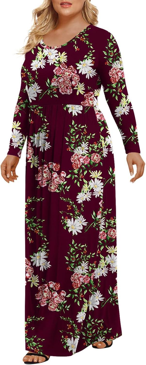 LONGYUAN Women's Plus Size Maxi Dresses for Curvy Women Casual Long Dress XL-6XL(Fl Wine Red+sleeve)