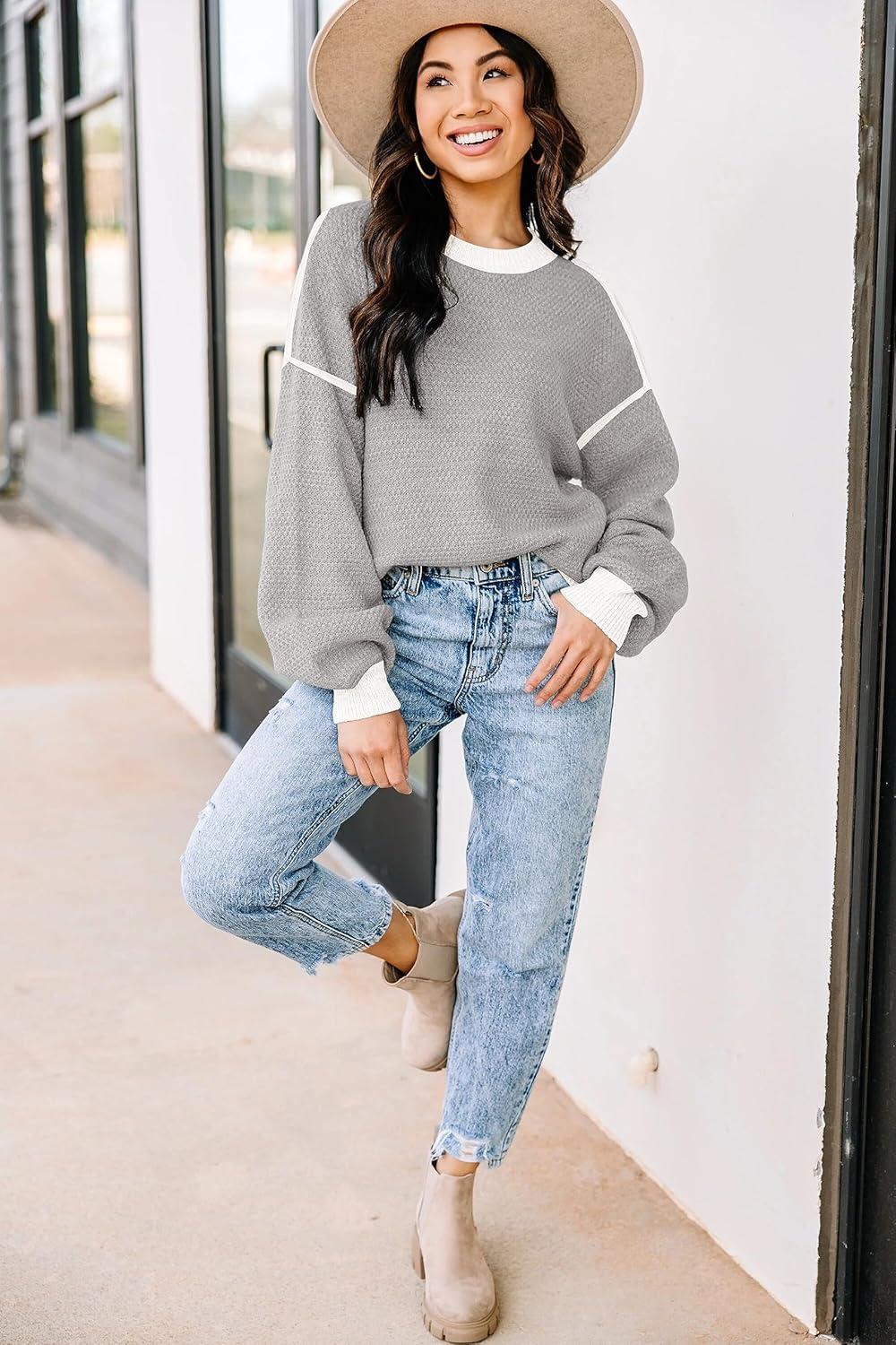 Womens Sweaters Fall 2025 Fashion Long Sleeve Color Block Oversized Sweater Trendy Casual Crew Neck Knitted Tops Pullover(Pure Grey)