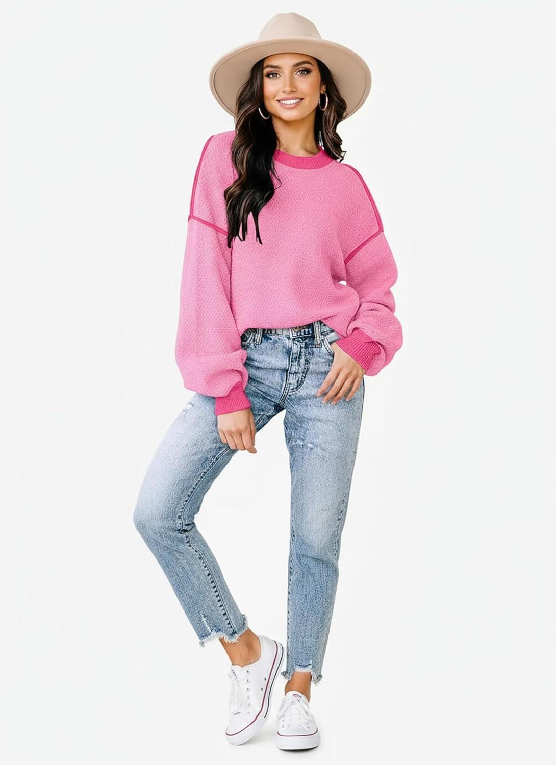 Womens Sweaters Fall 2025 Fashion Long Sleeve Color Block Oversized Sweater Trendy Casual Crew Neck Knitted Tops Pullover(Pure Pink)