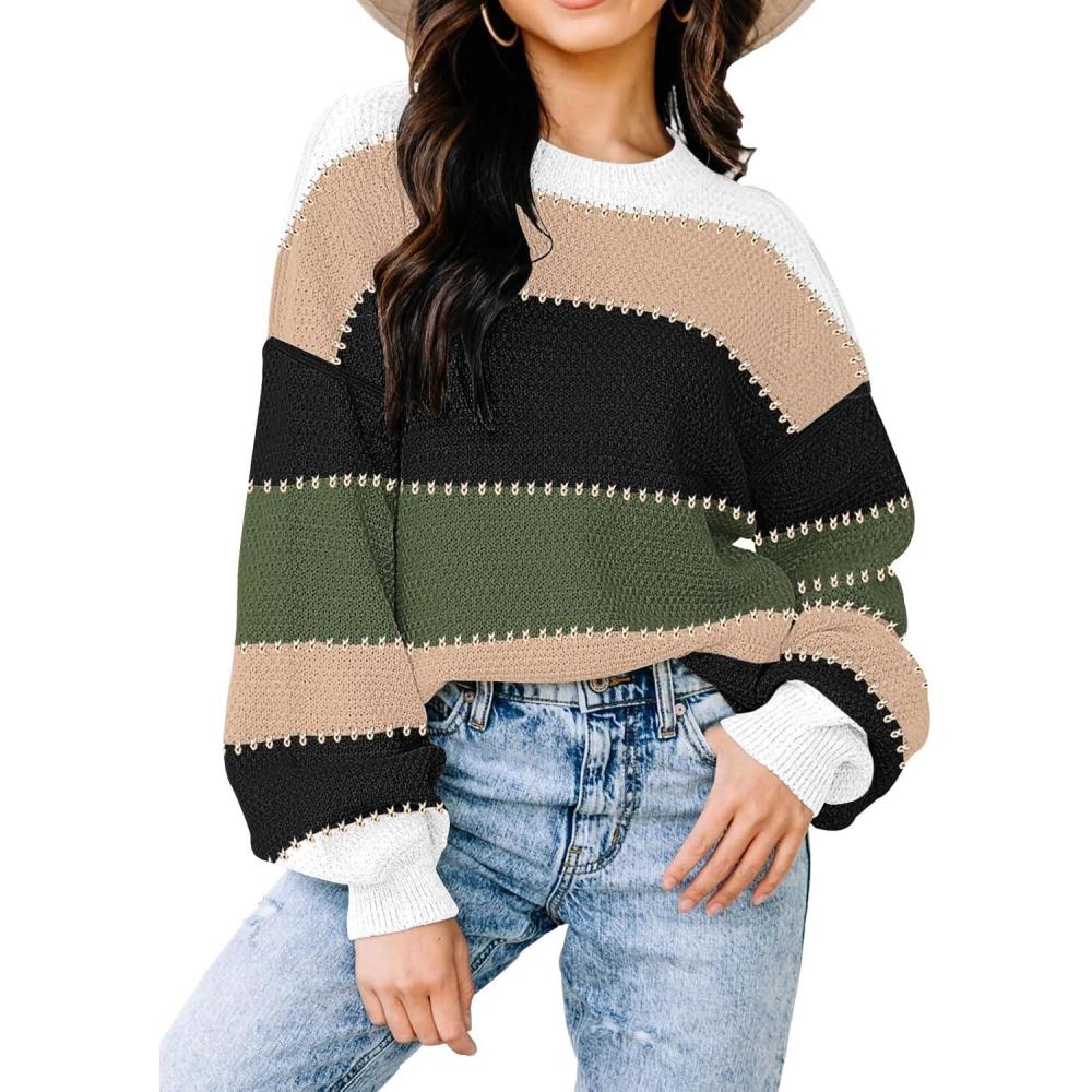 Womens Sweaters Fall 2026 Fashion Long Sleeve Color Block Oversized Sweater Trendy Casual Crew Neck Knitted Tops Pullover(Color Darkgreen)